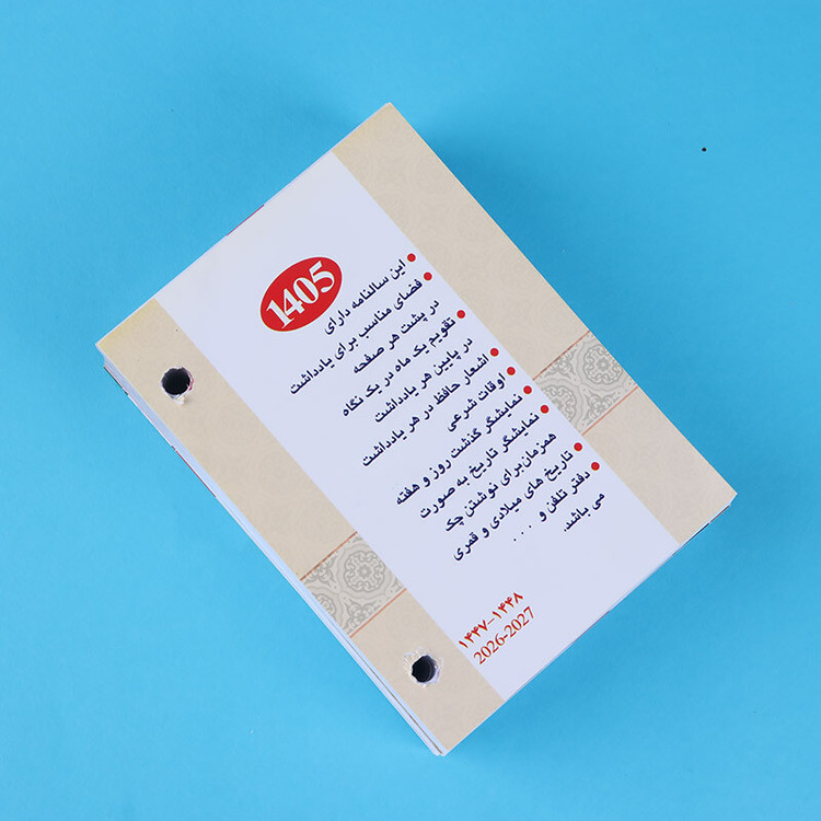 پانچ شده، مناسب برای قرارگیری در پایه تقویم رومیزی، مشاهده تقویم یک ماه در یک نگاه در پایین هر یادداشت