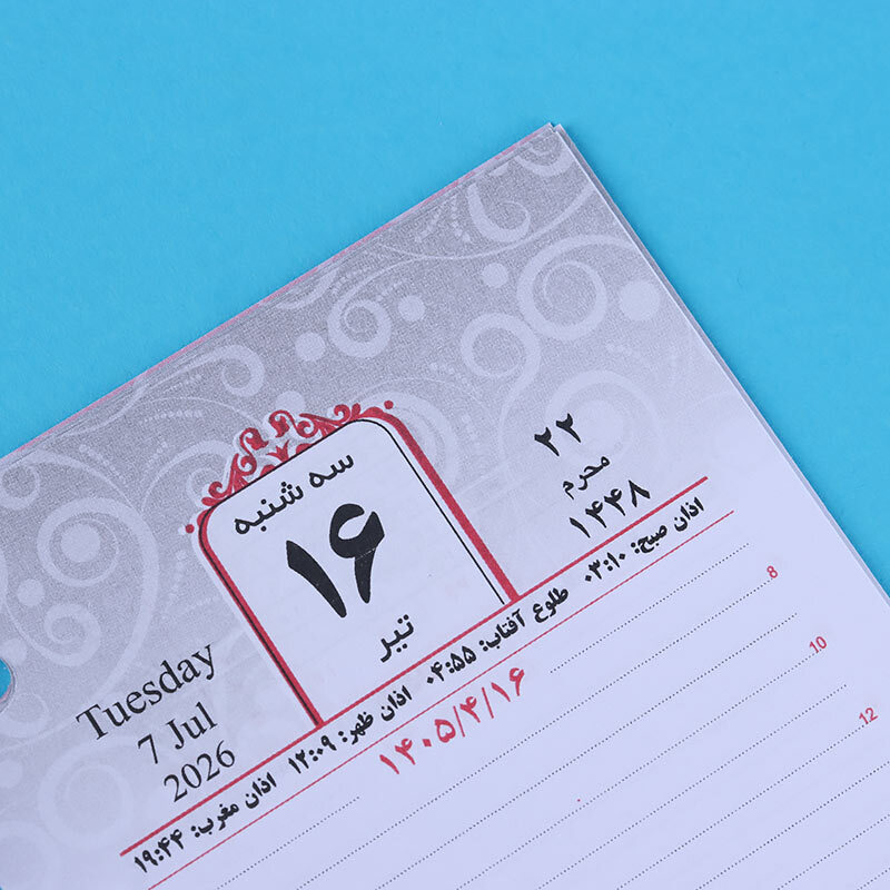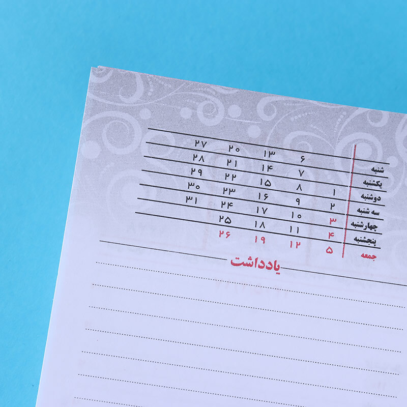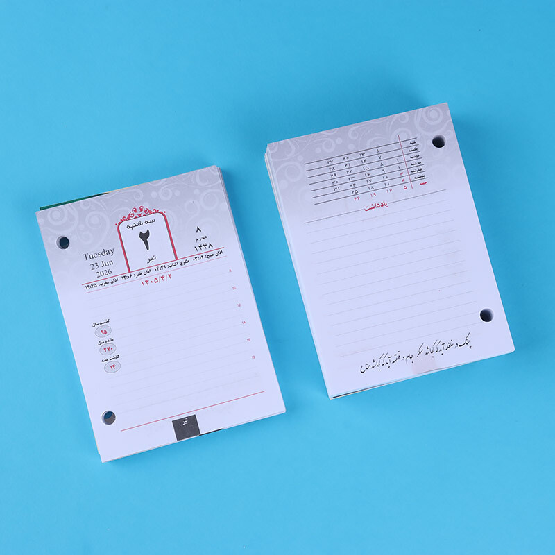 پانچ شده، مناسب برای قرارگیری در پایه تقویم رومیزی، مشاهده تقویم یک ماه در یک نگاه در پایین هر یادداشت