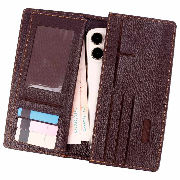 طراحی شده به صورت مستطیل شکل از جنس چرم، مناسب برای جاگیری در جیب مخفی کت و پالتو