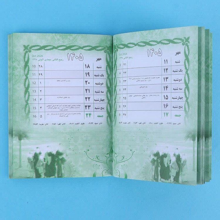 دارای جلد مقوایی با برخورداری از تاریخ های قمری، شمسی و میلادی به همراه مناسبت ها