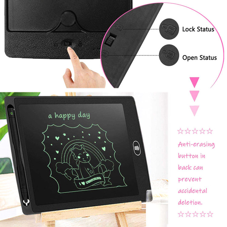 در بخش بالای این محصول یک استند قلم وجود دارد تا همیشه قلم و تبلت در کنار هم باشند و به آسانی بتوانید از آن استفاده کنید. همچنین در بخش زیرین این محصول یک دکمه DELETE یا حذف نوشتار وجود دارد که با زدن آن نوشتار روی صفحه نمایش حذف شده و میتوانید مجدد همانند یک برگه ی خالی شروع به نوشتار کنید.
