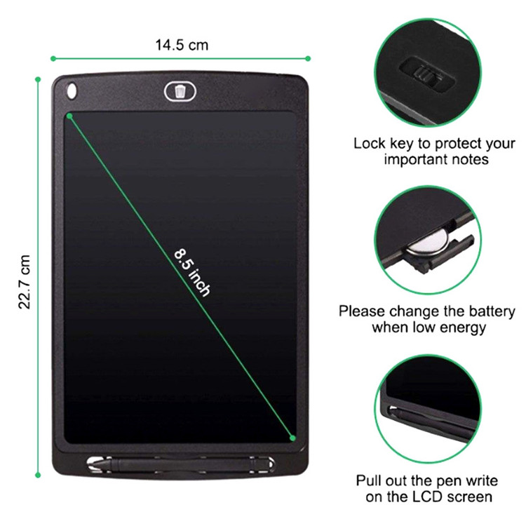 این محصول دارای یک صفحه نمایش 8.5 اینچی LCD ساخته شده از تکنولوژی E-paper است که نوشتاری راحت و روان با قابلیت کنترل ضخامت نوشتار، صفحه نمایش مات جهت جلوگیری از آزار چشم و بدون نور پس زمینه است تا بتواند جذاب تر از همیشه نوشتار بر روی یک برگ کاغذ یا یک تخته مشکی رنگ را برای شما به وجود بیاورد فقط کافی است قلم را بر روی صفحه بکشید تا با رنگ سبز نوشتار بر روی صفحه نمایش ظاهر شوند.