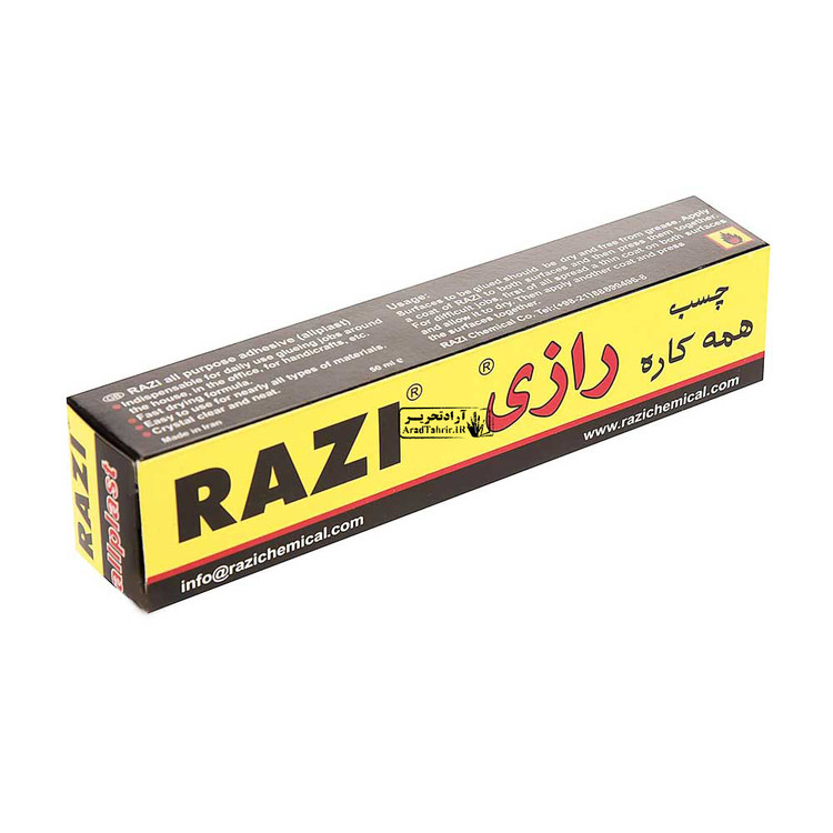 چسب همه کاره رازی، شفاف و دارای چسبندگی فوری و قوی است و قابل استفاده در محل کار، خانه، مدرسه برای کارهای دستی، مدل سازی و… می باشد. از جمله ویژگی های چسب رازی می توان به کاربرد سریع و آسان برای چسباندن کاغذ، شیشه، چینی، پلاستیک، نمد، سرامیک، لاستیک، چوب پنبه، پارچه، چرم، مقوا و… اشاره کرد.