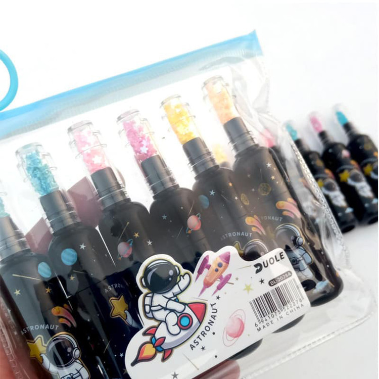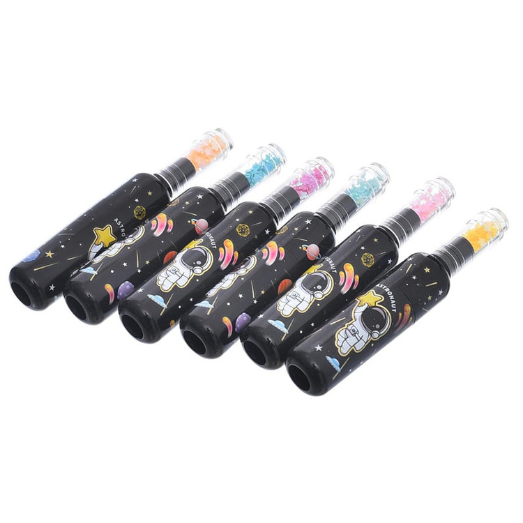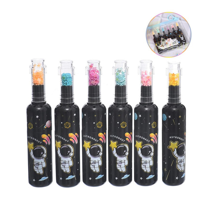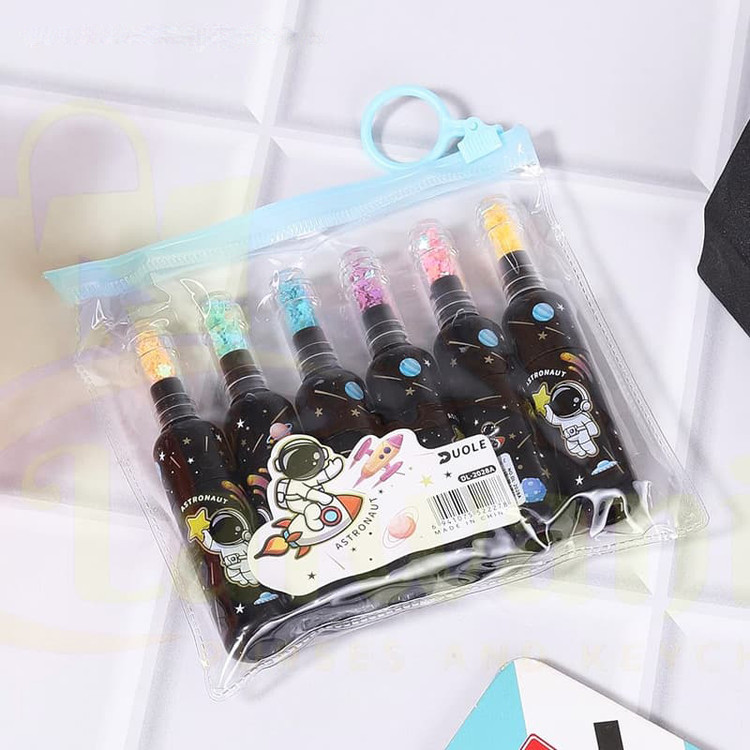 هایلایتر کپسولی طرح فضانورد شامل 6 عدد هایلایت کهکشانی فانتزی در 6 رنگ مختلف است که درون یک کیف پلاستیکی شفاف بستهبندی شدهاند.